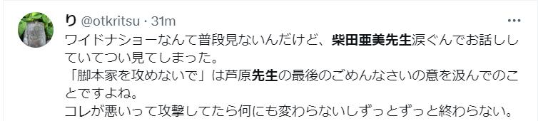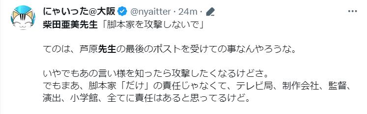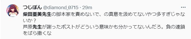 Xでの芦原さんの投稿は、読む人によっては、もしかしたら制作側を非難するような投稿をしたようにとれたのかも知れません。