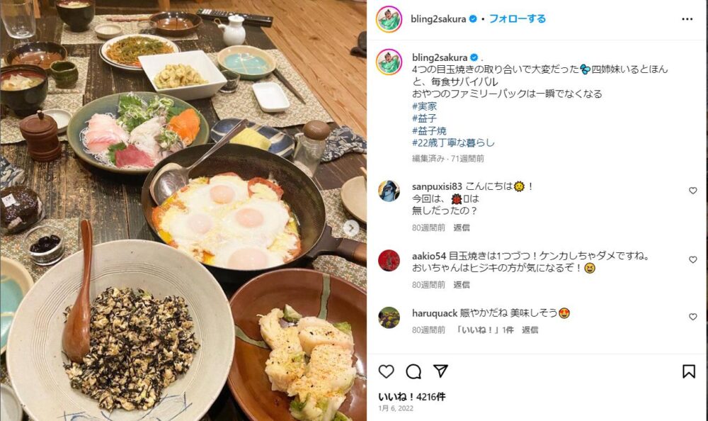 井上咲楽さんのSNSに出て来る井上家の料理は、どれも美味しそう。